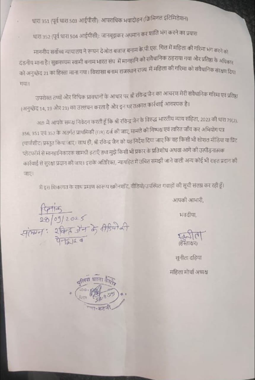 अतः मैं आपसे निवेदन करती हूं कि रविन्द्र जैन के विरुद्ध भारतीय दंड संहिता 2023 की धारा 79(2),356,351एवं 352 के अंतर्गत प्राथमिकी FIR दर्ज की जाए मामले की निष्पक्ष एवं त्वरित जांच कर अभियोग़ पत्र प्रस्तुत किया जाए।साथ ही रविन्द्र जैन को यह निर्देश दिए जाए कि वह किसी भी सोशल मीडिया या प्रिंट प्लेटफार्म से मानहानि कारक साम्रगी हटाएं तथा मुझे किसी भी प्रकार के प्रतिशोध अथवा आगे के उत्पीड़नात्मक कारवाई से सुरक्षा प्रदान की जाए।