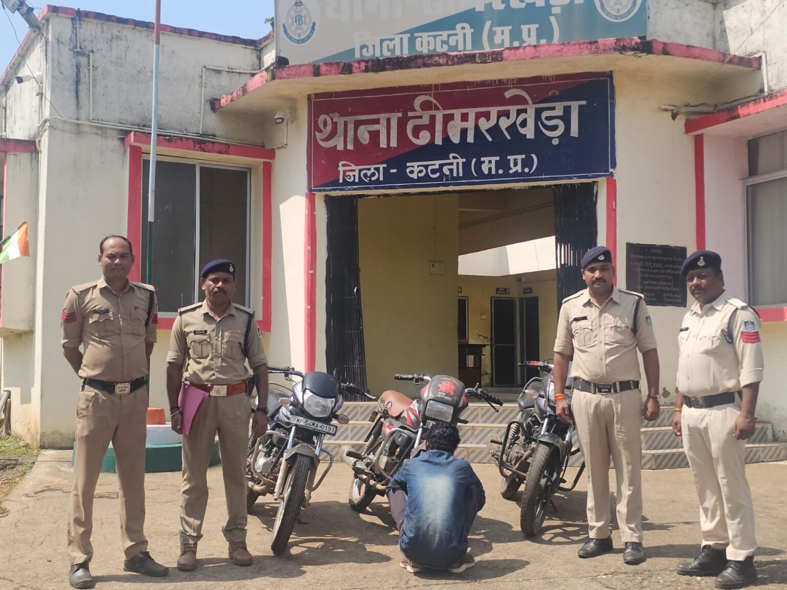 कटनी। ढीमरखेडा पुलिस ने वाहन चोरी की घटनाओं पर बड़ी कार्रवाई करते हुए एक शातिर चोर को गिरफ्तार किया है। पुलिस ने आरोपी के कब्जे से तीन चोरी की मोटरसाइकिलें बरामद की हैं, जिनकी कुल कीमत लगभग दो लाख रुपये आंकी गई है।